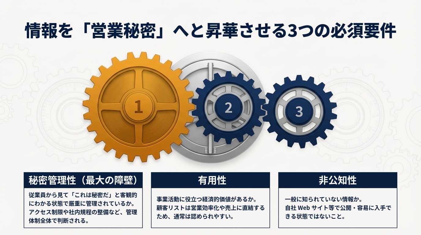 ただし、すべての顧客情報が法律で守られるわけではありません。裁判で会社側の主張が認められるためには、もち出された顧客情報が法律上の「営業秘密」としての要件を満たしている必要があります。特に、会社がその情報をどれだけ厳重に管理していたかという「秘密管理性」が最大の争点となります。